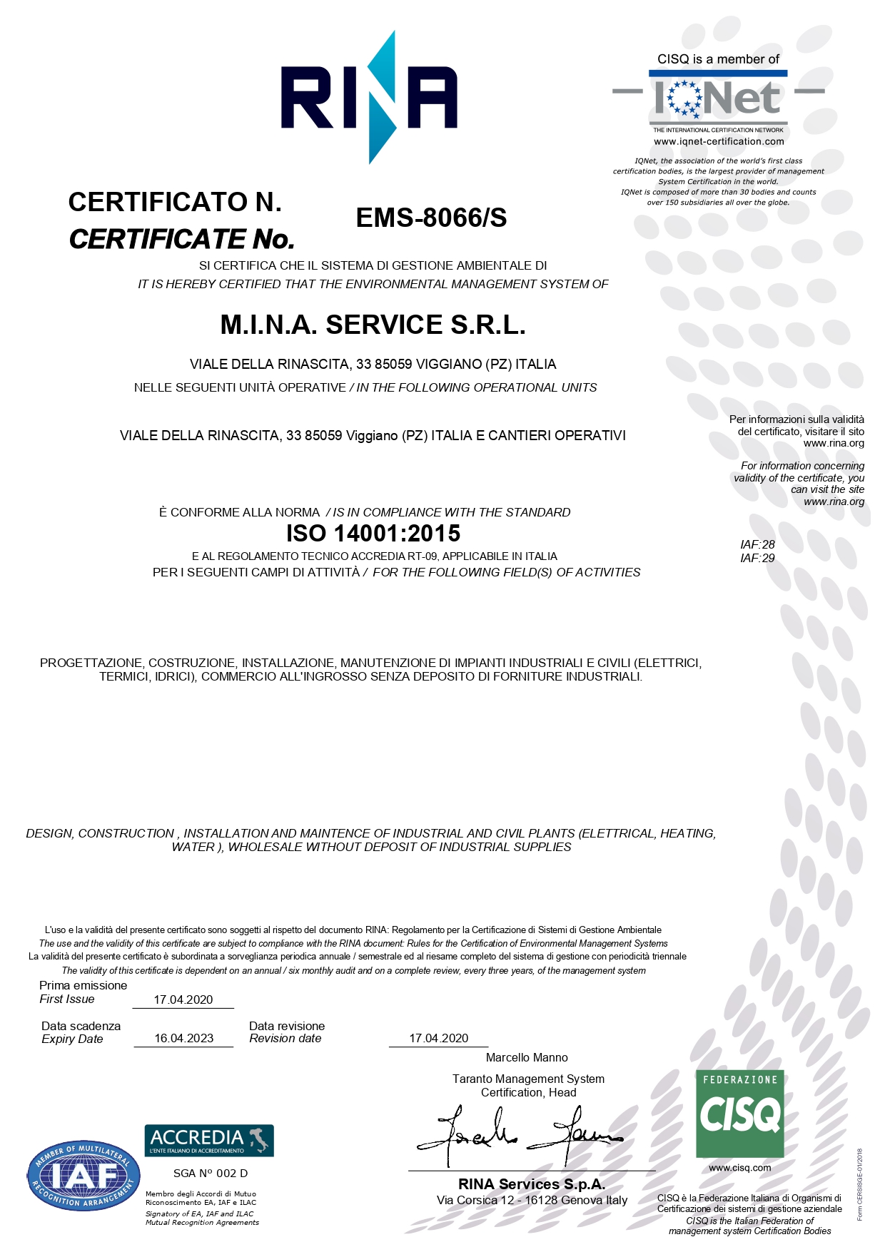 Siamo impegnati a garantire una prestazione completa e di alto livello con l'obiettivo imprescindibile della piena soddisfazione del cliente e il rispetto delle persone e dell'ambiente.